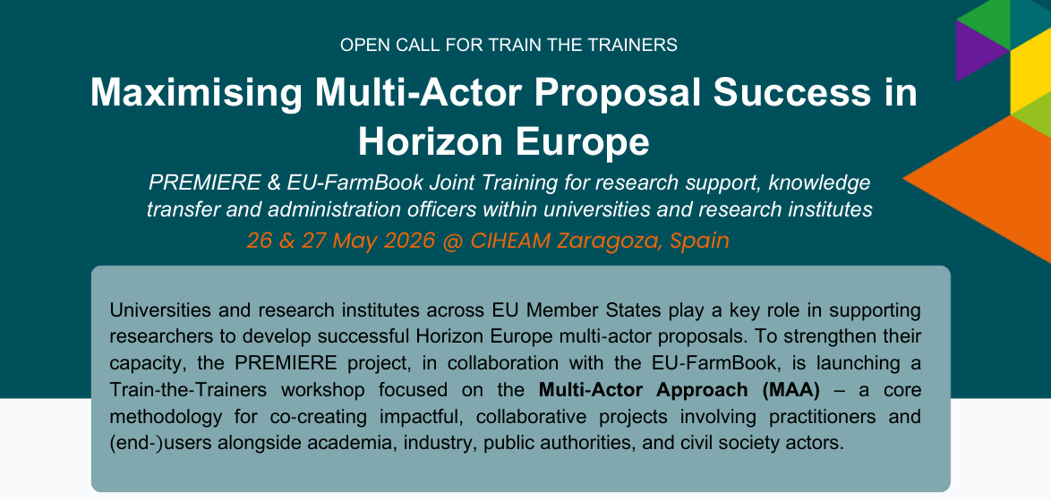 The PREMIERE Project, in collaboration with EU‑FarmBook, invites research support, knowledge transfer and administration officers from universities and research institutes to apply for a Train-the-Trainers workshop focused on the Multi-Actor Approach (MAA) in Horizon Europe. The training will take place 26–27 May 2026 at CIHEAM Zaragoza, Spain.
